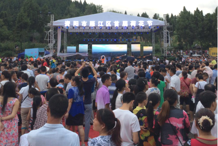 今晚的丹山,人山人海,观万亩荷塘,赏琴棋书画,品特色小吃,一条龙服务步步到位。演出场外,部分游客带上凳子,端起茶杯,找准了最佳观赏位置。抱小孩的则是用心良苦,均采取“马马肩”姿势,翘首以待。7时30分,在激情四溢的开场舞表演中,开幕式正式启动。