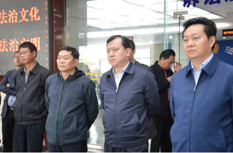 图为:市委副书记、市依法治市领导小组常务副组长段再青(右1),市委常委、政法委书记、市依法治市领导小组副组长李丹(右2),副组长唐永良(右3),副组长雷明(右4)等相关领导参观法治示范点。