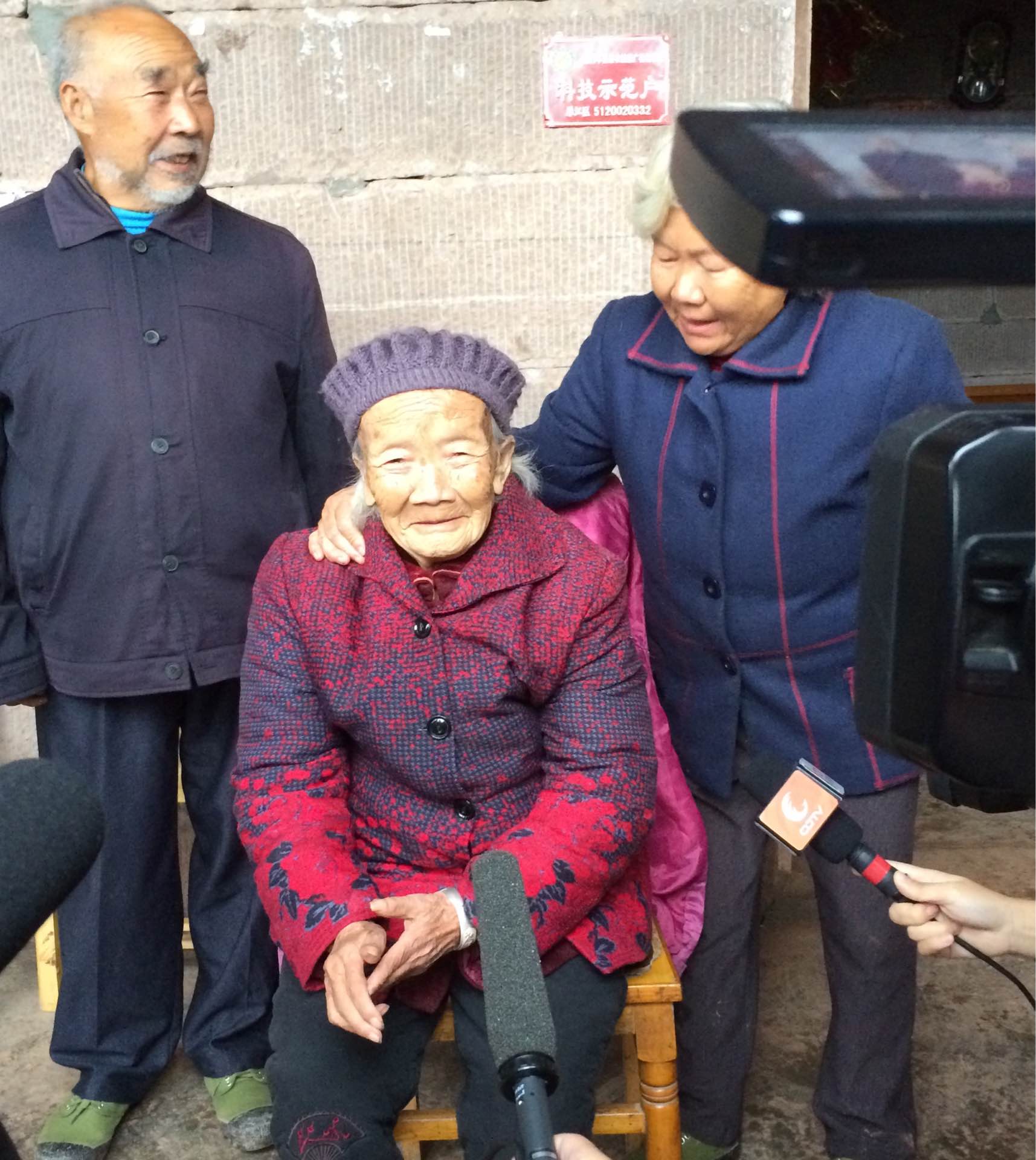 25日上午,采风组来到资阳市雁江区中和镇明月村百岁老人陈素华(以下简称陈老太)的家中,亲自探访老人的长寿秘诀。刚迈进大门,一位坐在堂屋门口边衣着干净,精神矍铄的老人进入大家的视线。她就是百岁老人陈素华。经过100年的洗礼,陈老太的眉目、发梢、手指……均已留下了岁月的痕迹。10月的天气已渐微凉,加上数日来的阴雨,让人备感无秋,直觉已经入冬了。镜头下的陈老太并没有因天气原因,显得瑟瑟缩缩,反而十分热情的欢迎采风组的到来。由于年岁已大,陈老太听力不太好,她72岁的女儿李秀菊和74岁的女婿舒世栋,分别站在她的两侧当“翻译”,俯首耳语的画面温暖了这个凉意十足的金秋。