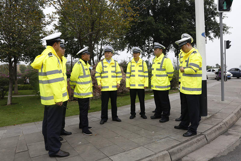 图为:交警支队长颜成章(左四)率队调研交通秩序管理工作