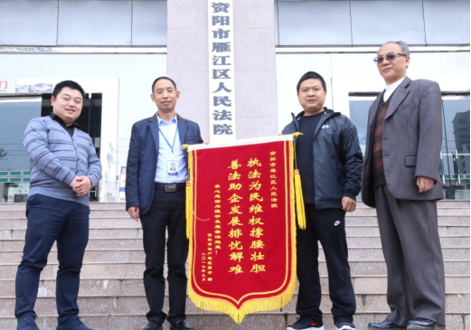 11月6日,资阳市雁江区法院收到市工商联副主席唐易辉送来的一面锦旗,“执法为民维权撑腰壮胆,善法助企发展排忧解难”两排大字是对法院秉承执法为民宗旨的肯定。赠送锦旗后,该院党组书记、院长汪自友邀请唐易辉主席、市地产建筑商会秘书长杨成学及市民营企业维权中心工作人员参加了座谈会。