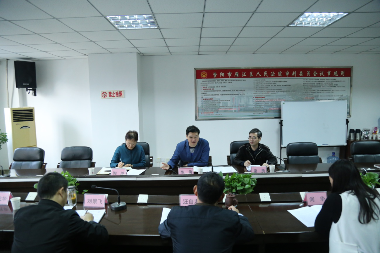 11月13日,记者在资阳市雁江区法院获悉,市中院新上任党组成员、政治部主任陈俊莅临该院指导工作,政治部副主任梁勇、政治部人事处处长陶玲陪同指导。该院院长汪自友、副院长刘崇飞以及政治处、机关党委、研究室全体干警参加会议。