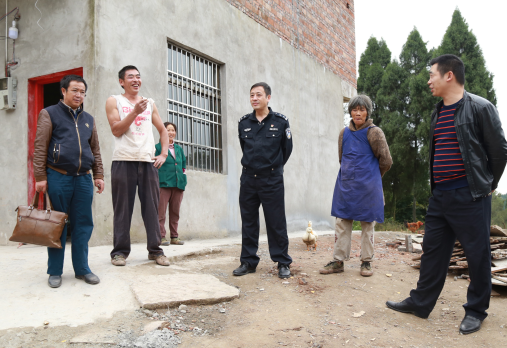图为:交警大队长吴鹏飞(右三)与农户拉家场