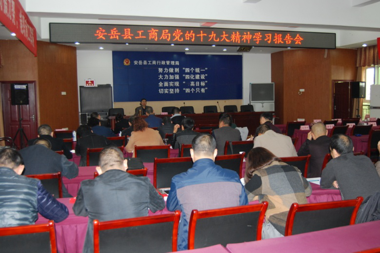 11月14日,安岳县工商局召集局党组成员、各工商所、股(室)、队负责人在县局五楼会议室,围绕学习领会习近平新时代中国特色社会主义思想,开展专题学习,深入贯彻党的十九大精神。
