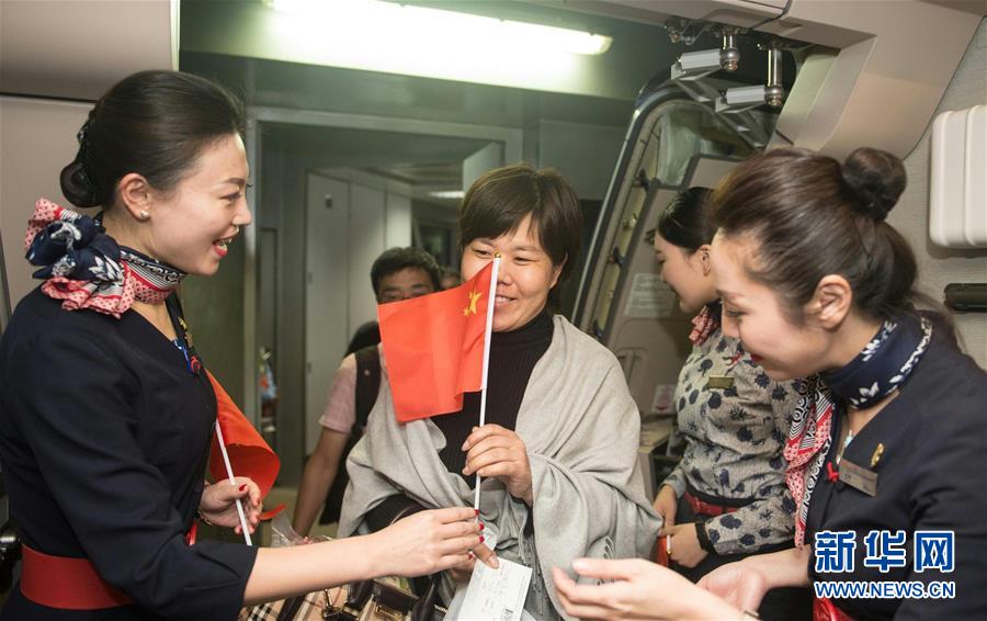 12月3日凌晨,在由印度尼西亚巴厘岛飞往中国上海的东方航空公司MU5030次航班上,乘务员为中国旅客发放国旗。当日,由于风向条件许可,受印度尼西亚巴厘岛阿贡火山喷发影响的巴厘岛伍拉莱国际机场继续开放,中国游客继续撤离巴厘岛。新华社记者杜宇摄