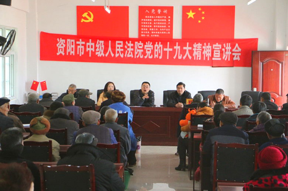 为深入宣传党的十九大精神,进一步增强“走基层”活动和脱贫攻坚实效,资阳市中级人民法院认真落实市委驻村帮扶工作要求,分期分批组织帮扶责任人在年底前与帮扶对象进行全覆盖结对帮扶。12月26日,在院党组书记、院长李俊的带领下,该 院20余名中层以上干部前往安岳县永顺镇常乐村和石桥铺镇秀才村,以宣讲党的十九大精神为主题,扎实开展结对帮扶工作。