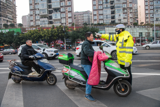 “这是红灯,请等一下。”在市政府路口,一位市民骑着电瓶车欲闯红灯,被陈激的女同事拦下,并劝导道。由于一些原因,行人、非机动车闯红灯、非机动车不按规定道路行驶等乱象有不同程度地存在,我市就在城区开展了道路交通综合整治,在节日期间交警部门也没有丝毫松懈,当天就派出40余人,15台车持续开展整治。