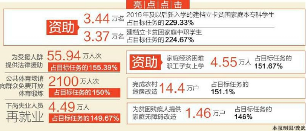 关注低收入群众生活。去年,我省低保对象累计月人均补助,城市达到480元,农村达到300元;30.12万户困难职工得到生活、医疗救助,实现对符合条件的建档困难职工的全覆盖;16.41万名农村残疾人获得发展生产扶持,占目标任务的164.1%;对符合医疗救助条件的重点救助对象,经各类医疗保险报销后的政策范围内住院自负费用,在年度救助限额内的救助比例达到71%。同时,资助3.44万名2016年及以后新入学的建档立卡贫困家庭本专科学生,占目标任务的229.33%;资助3.37万名建档立卡贫困家庭中职学生,占目标任务的224.67%。
