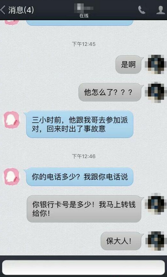 四川在线资阳站记者从截图上看到,对方用QQ添加了杨警官的一位朋友后,直接甩了一张“杨警官”躺在病床上微笑的照片给杨警官的朋友,并附上一句“你认识他吗?”,杨警官的朋友问:“请问你是?”对方回答:“杨×的朋友,你是他的家属吗?”杨警官的朋友故作惊讶的问:“是啊,他怎么了???”对方见鱼儿已上钩,便说:“三小时前,他跟我哥去参加派对,回来时出了事故,你的电话多少?我跟你电话说。”杨警官的朋友立刻问道:“你的银行卡号多少?我马上转钱给你!保大人!”朋友的一句“保大人”令杨警官哭笑不得。