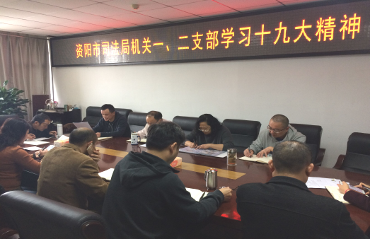 11月6日,资阳市司法局召开支部党员大会,集中学习党的十九大精神,在家班子成员以普通党员身份参加了学习。局党委委员、政治部主任徐荣志领学了党的十九大精神。