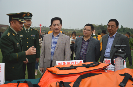 图为:副市长吴宗权(右三)、市依法治市办主任秦后权(右二)、市政府副秘书长周俊(右一)等领导参观消防器材设备