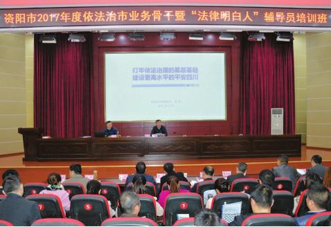 本报讯(蒋勇 张光才 记者吴显云文/图)昨(20)日,记者从资阳市依法治市办获悉,为深入学习党的十九大精神,全面贯彻中央、省委和市委关于法治建设的系列部署,坚定不移把全面依法治市推向深入,该市依法治市办、市司法局在市委党校举办了2017年度依法治市业务骨干暨“法律明白人”辅导员培训班。市委常委、政法委书记、市依法治市领导小组副组长李丹出席并讲话,省综治办专职副主任杨军等受邀作辅导讲课。