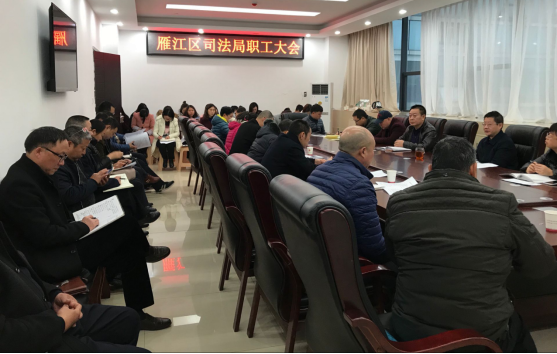 12月13日,资阳市雁江区司法局党组书记、局长吴兵主持召开全局职工会议,深入学习贯彻党的十九大精神,传达贯彻习近平总书记关于进一步纠正“四风”、加强作风建设的重要批示精神,就抓好贯彻落实进行安排部署。