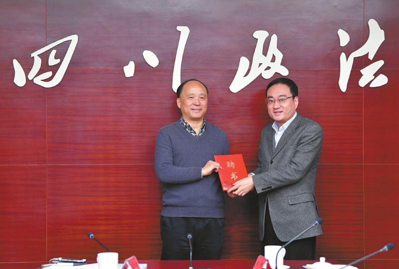 昨(21)日,省委政法委常务副书记余建(右)向四川大学法学院教授左卫民(左)颁发聘书张磊摄