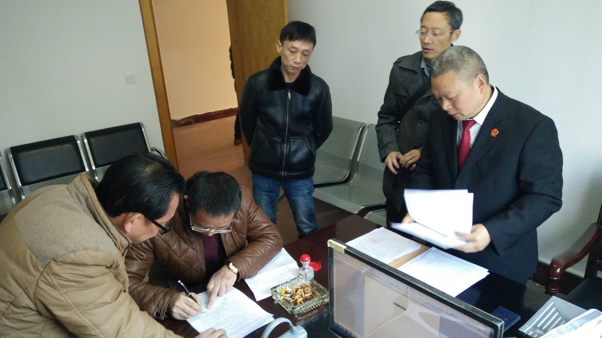 图为:法官到岳阳镇人民调委会现场对接调解